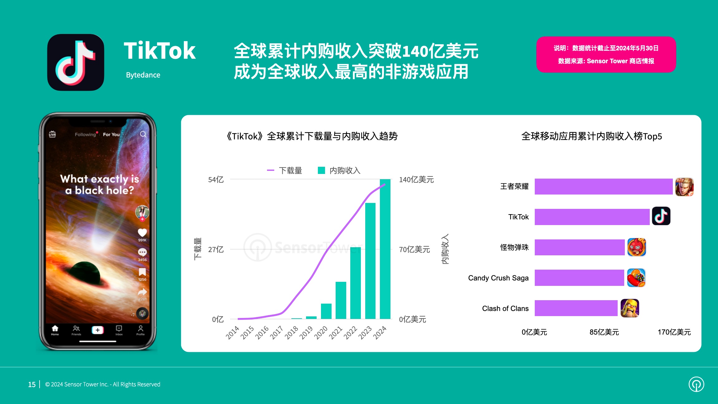 Sensor Tower数据显现,到2024年5月,“短视频+直播”使用《TikTok》全球累计内购收入超越140亿美元,成为全球收入最高的非游戏使用。与此同时,《TikTok》收入坚持微弱增加,2024年3月到达4.5亿美元,创前史新高。
