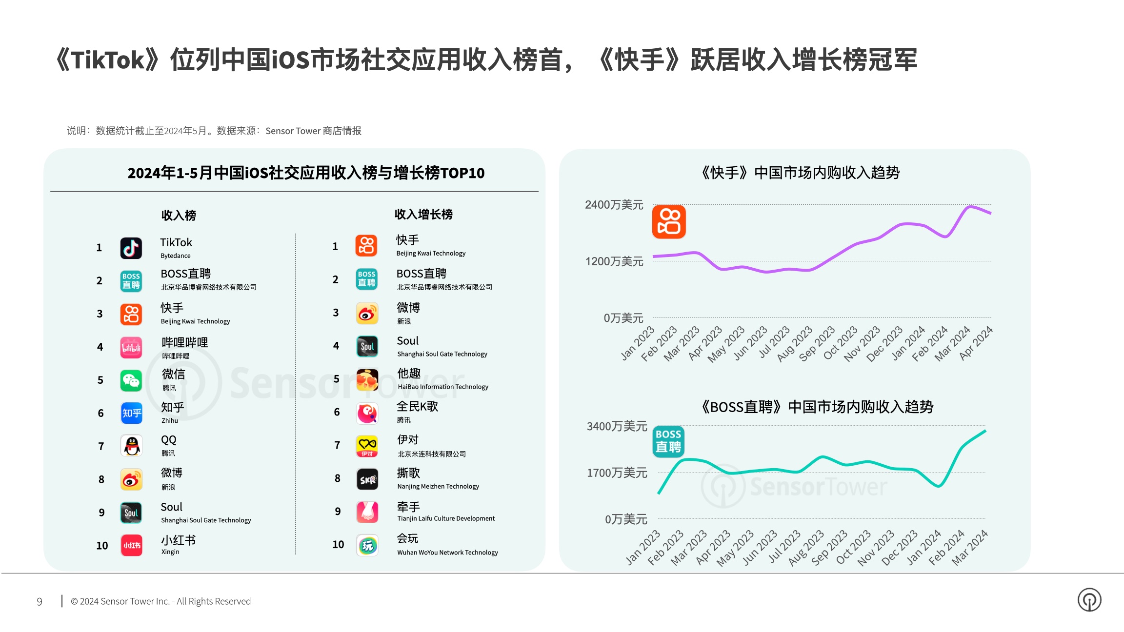 跟着企业用户的增加,2024年1-5月职场交际使用《BOSS直聘》内购收入同比上涨44%,跻身收入榜第2名,2024年第一季度财报显现BOSS直聘季度营收同比上涨33%。