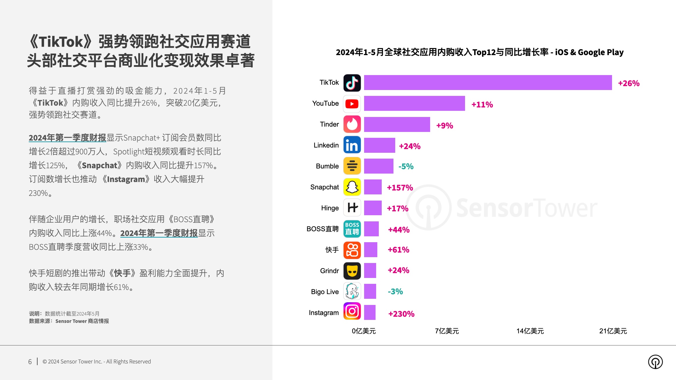 得益于直播打赏微弱的吸金才能,2024年1-5月《TikTok》内购收入同比提高26%,打破20亿美元,强势领跑交际赛道。