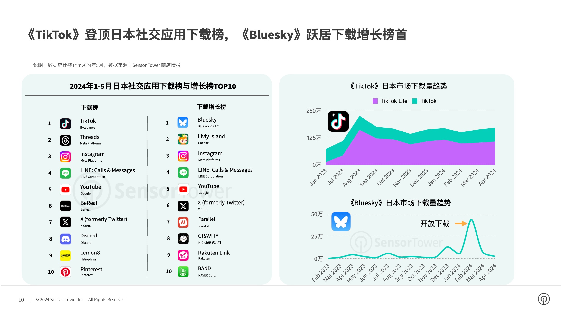 由约请制转变为敞开下载后,去中心化交际使用《Bluesky》在日本商场下载量敏捷飙升,成为2024年1-5月日本下载量增加最大的交际使用。