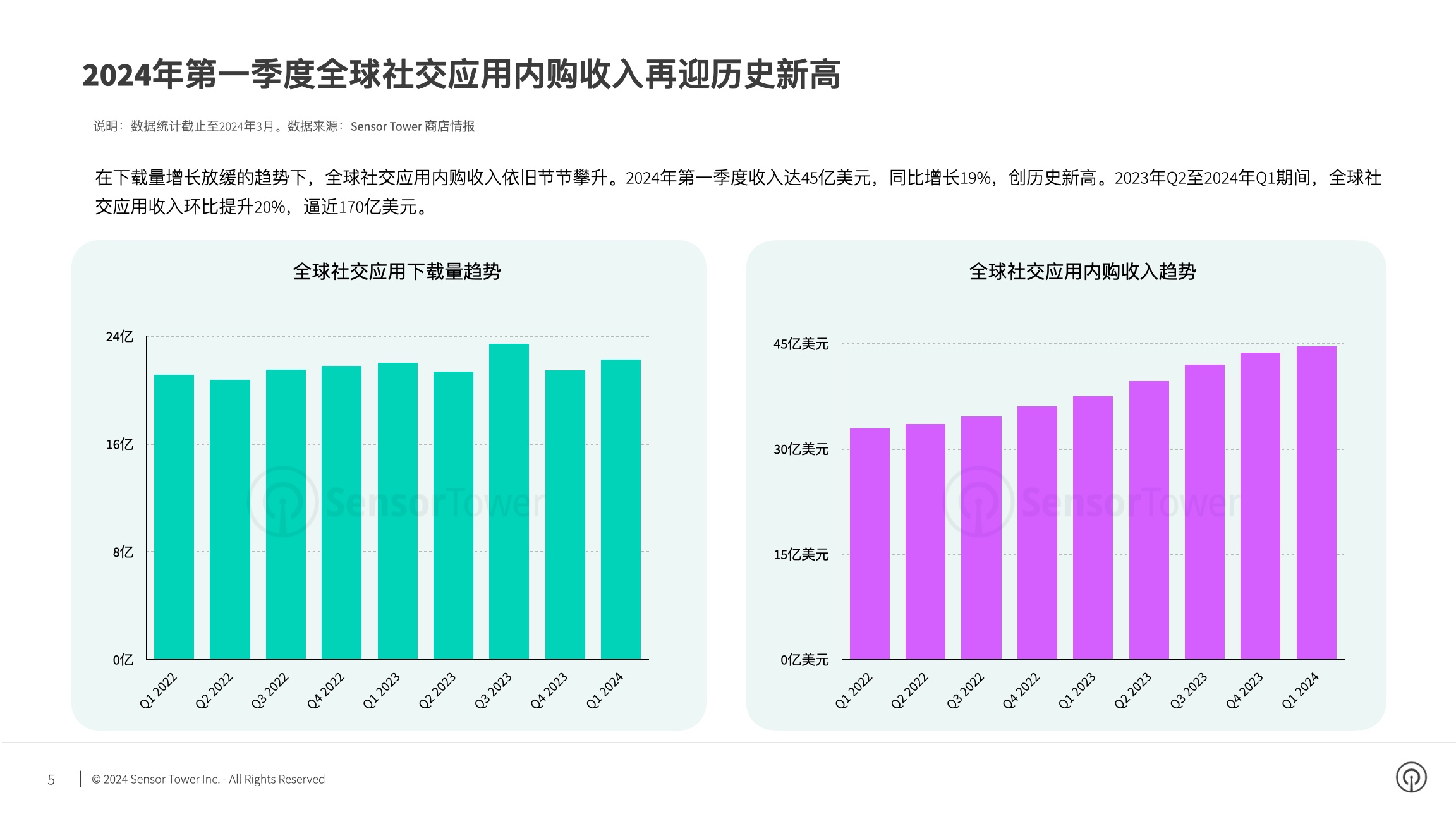 依据Sensor Tower发布的陈述,2024年第一季度,全球交际使用内购收入达45亿美元,同比增加19%,创前史新高。2023年Q2至2024年Q1期间,全球交际使用内购收入环比提高20%,迫临170亿美元。